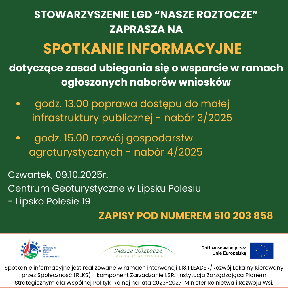 - godz. 15.00 Rozwój pozarolniczych funkcji małych gospodarstw rolnych poprzez rozwój gospodarstw agroturystycznych (rozwój GA) – nabór nr 4/2025